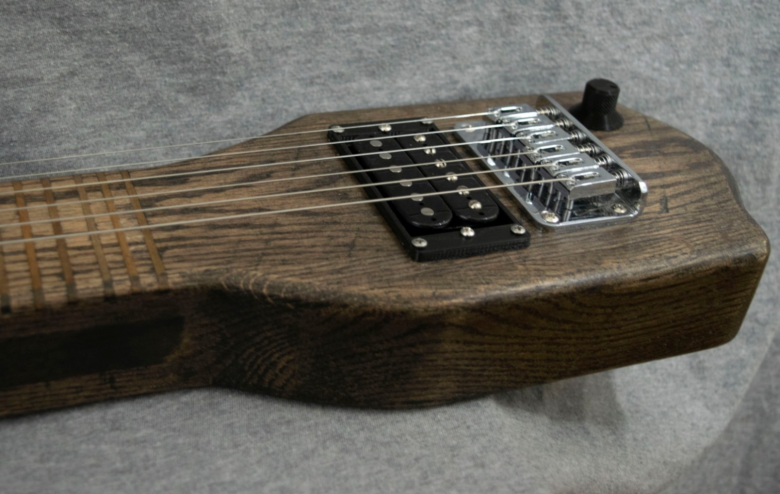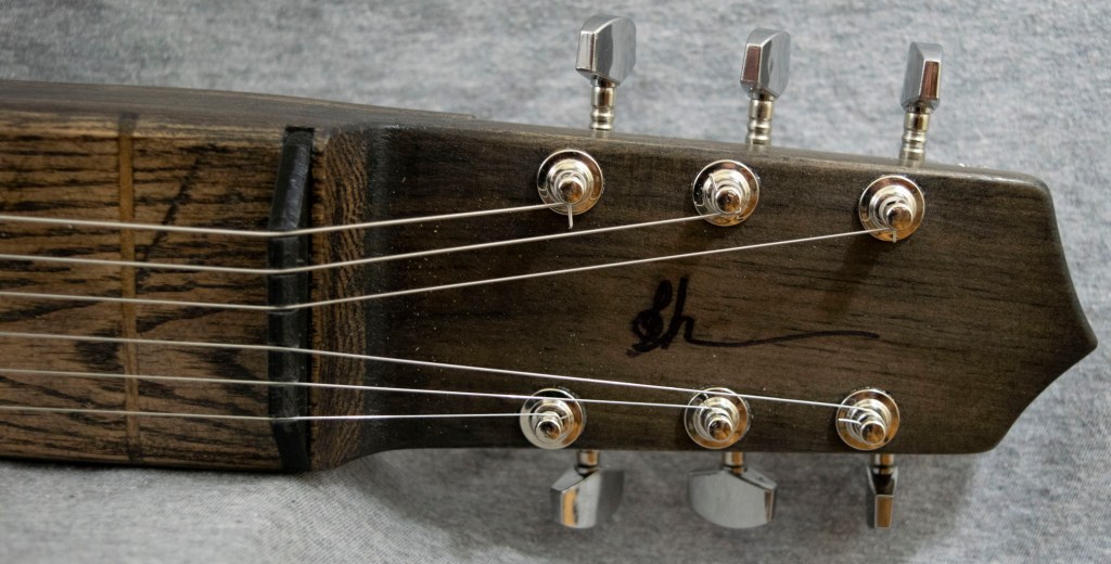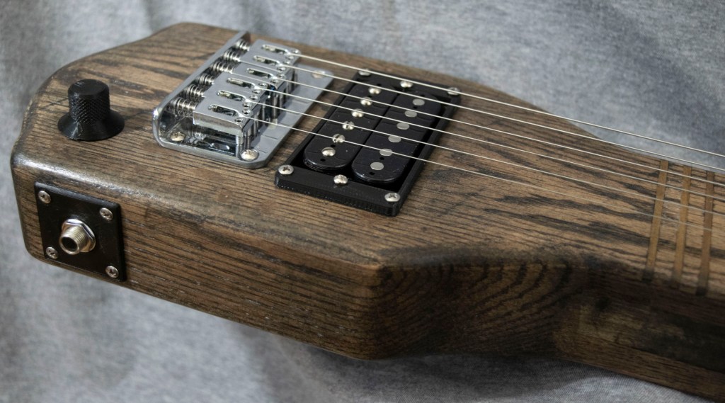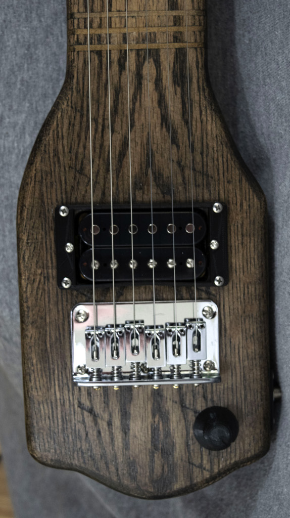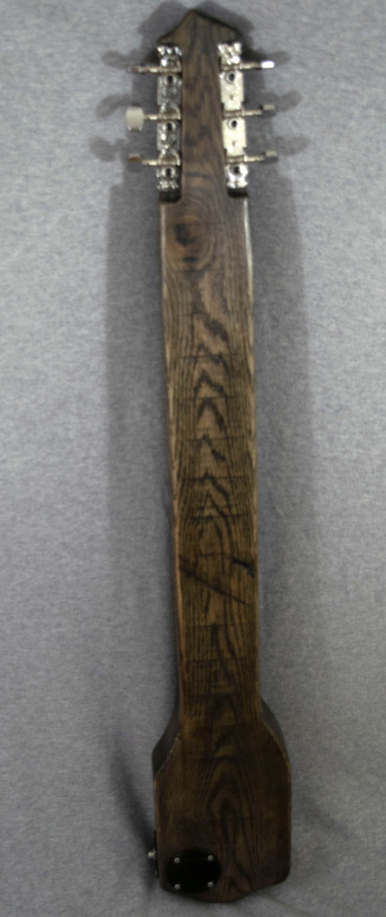 Going for a different feel and look, this lap steel is all red oak with integrated frets in the neck and keys placed on the back of the head. The all oak construction and thin natural finish gives a southern twang perfect for that rugged look.