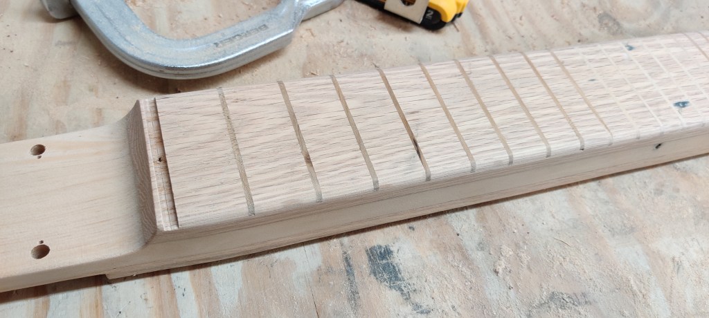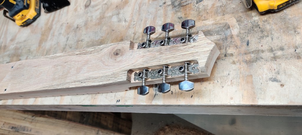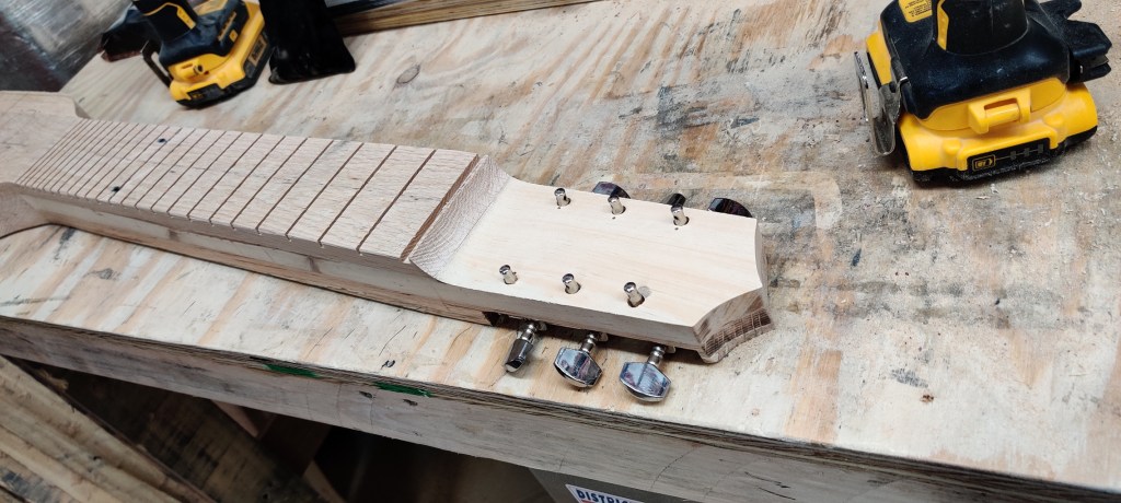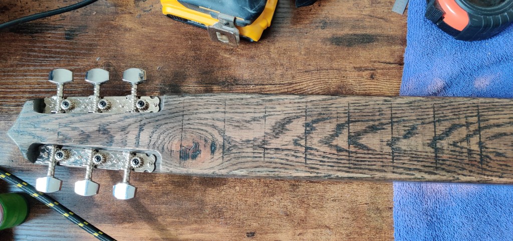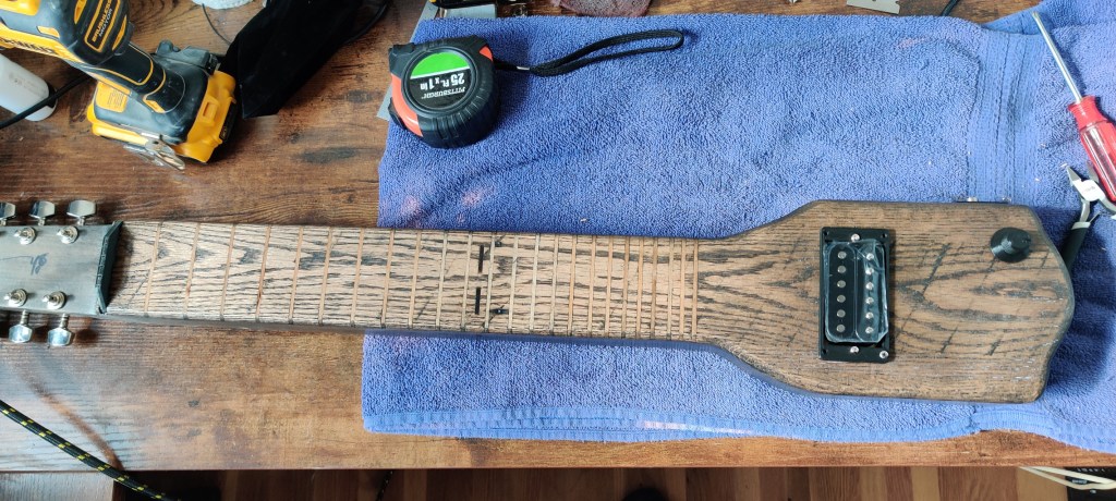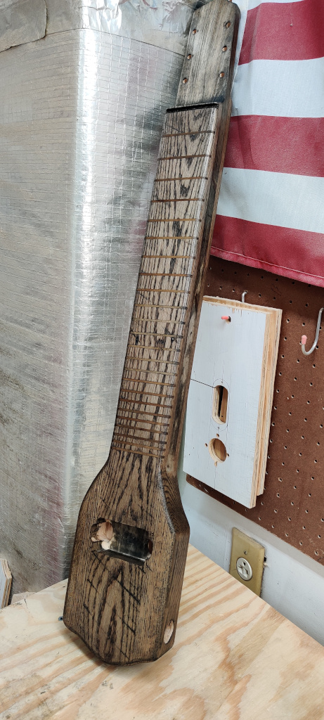 Going for a different feel and look, this lap steel is all red oak with integrated frets in the neck and keys placed on the back of the head. The all oak construction and thin natural finish gives a southern twang perfect for that rugged look.