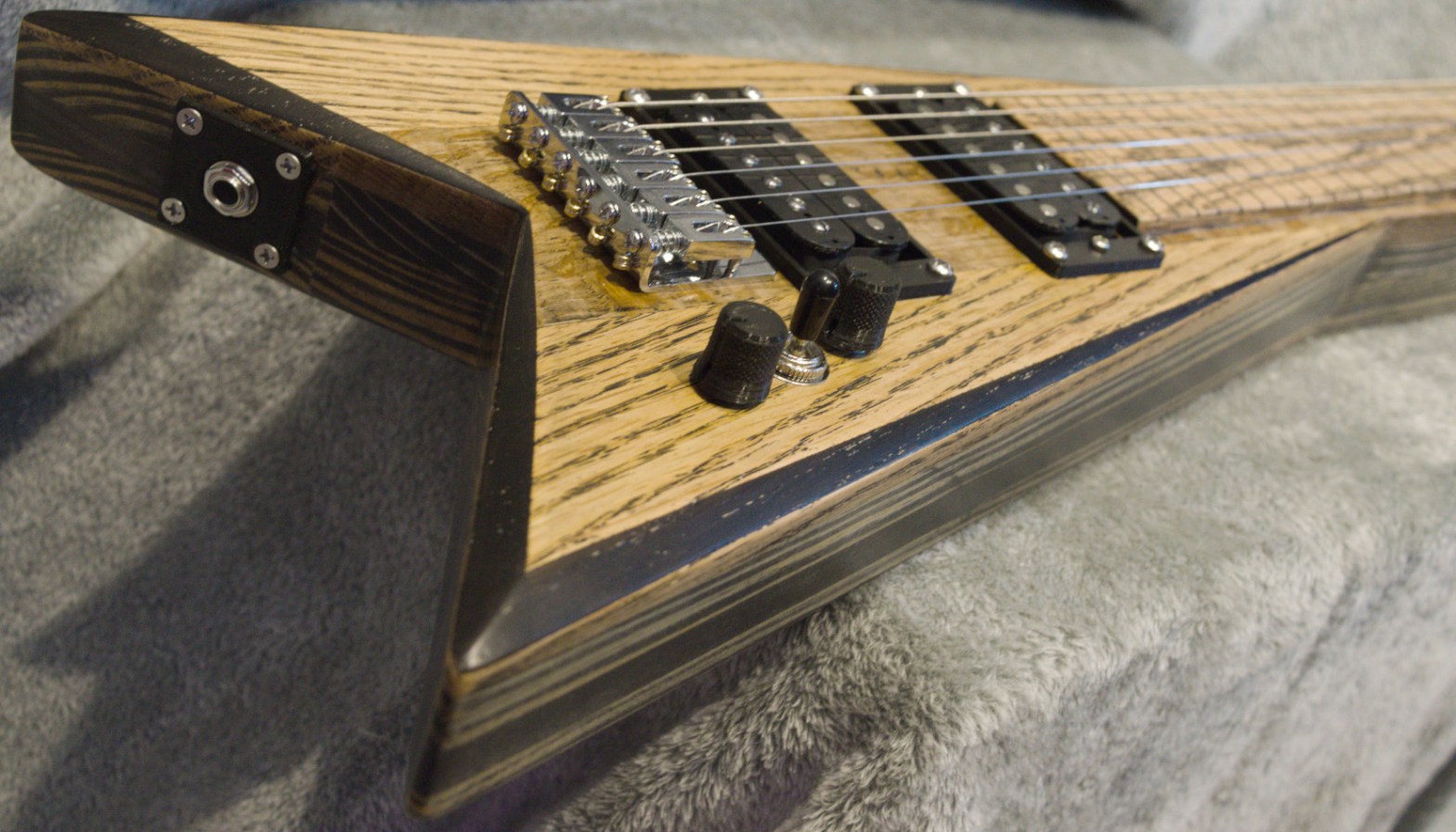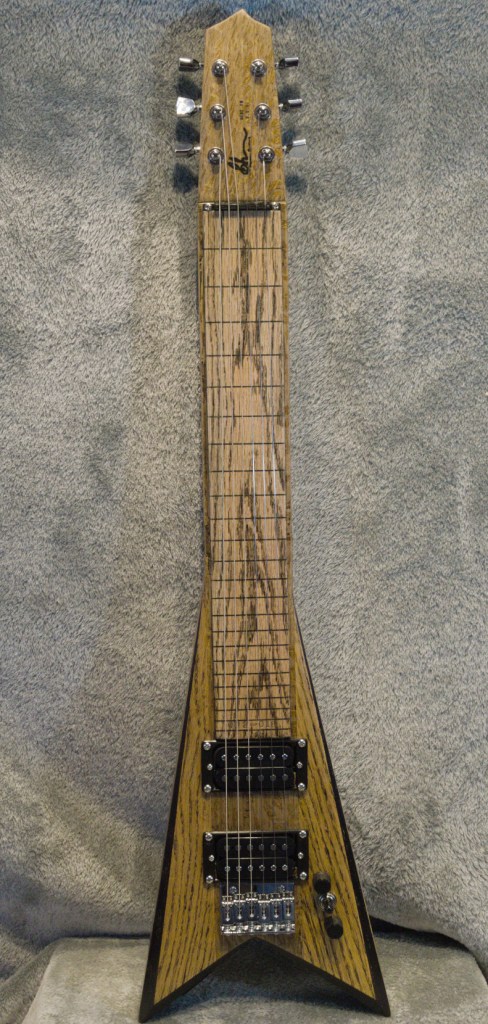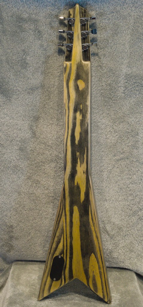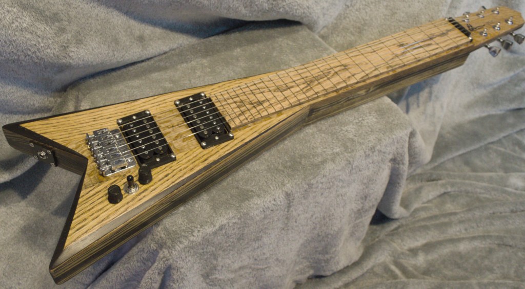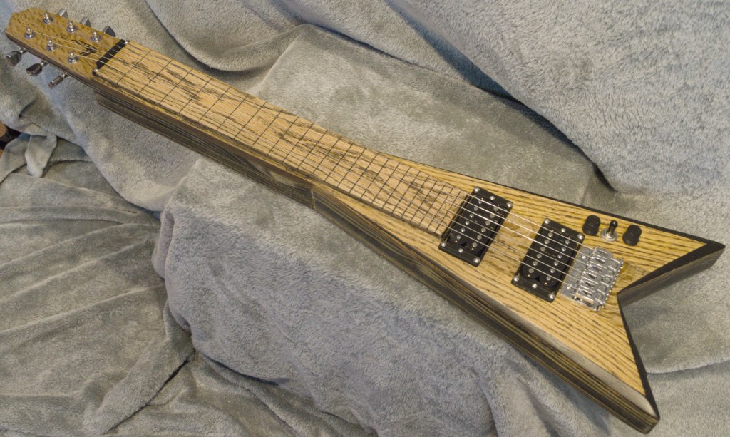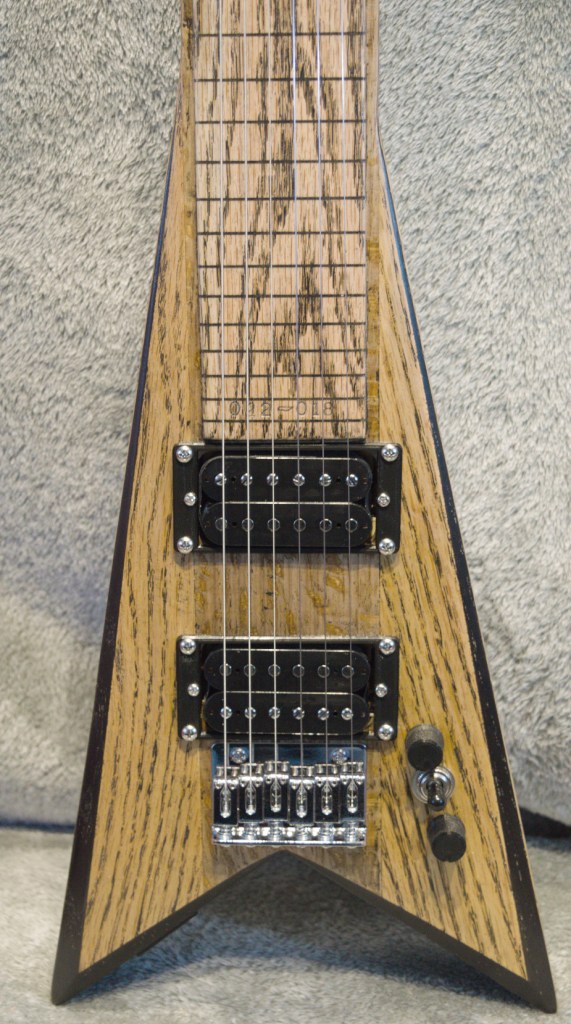 Dark grain stained oak has that certain pop that is reminiscent of antique furniture. This V with 2 humbuckers has that pop to go with its rustic look.