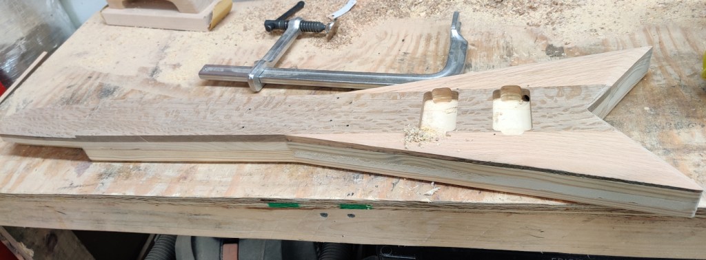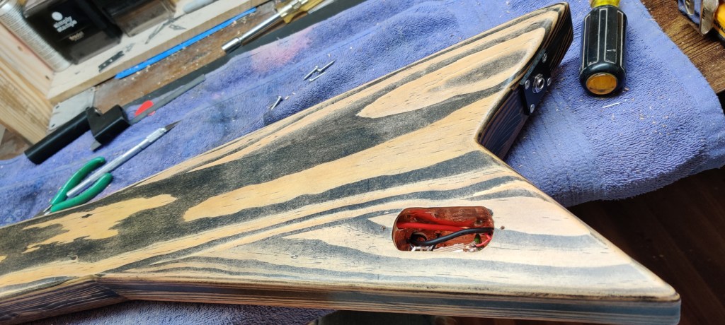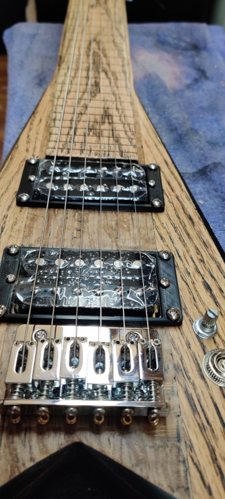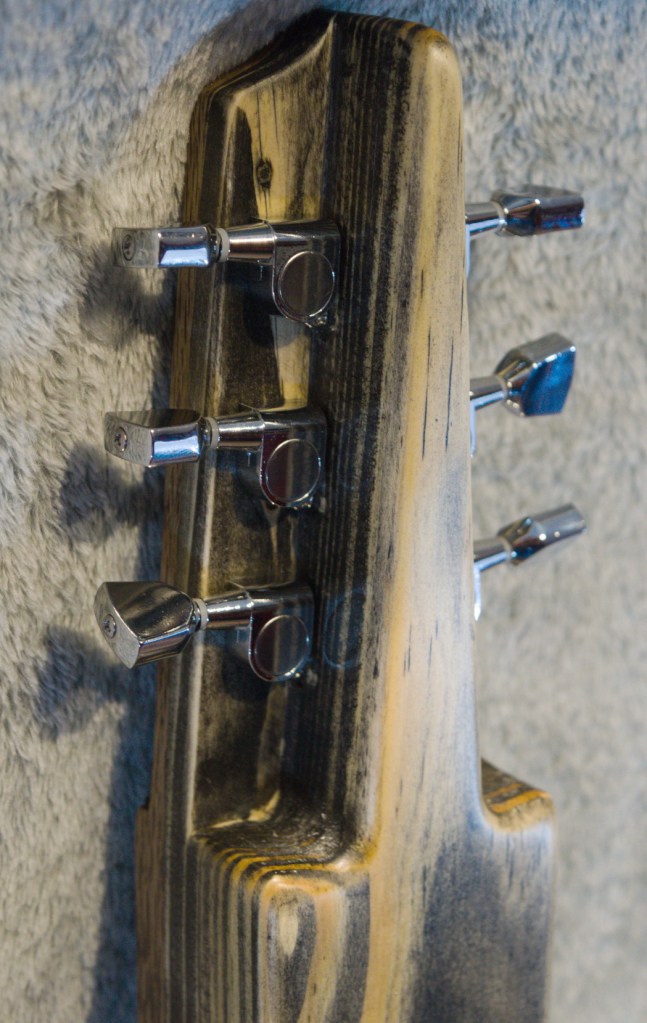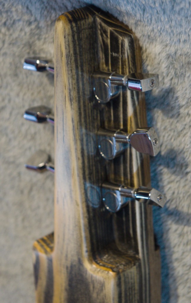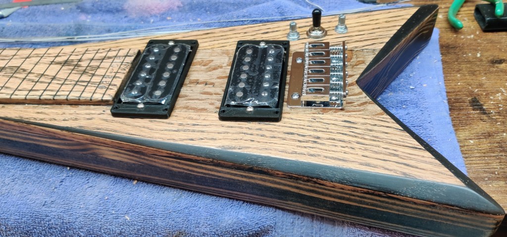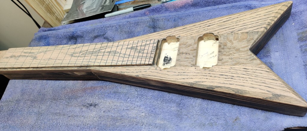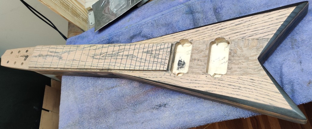 Dark grain stained oak has that certain pop that is reminiscent of antique furniture. This V with 2 humbuckers has that pop to go with its rustic look.