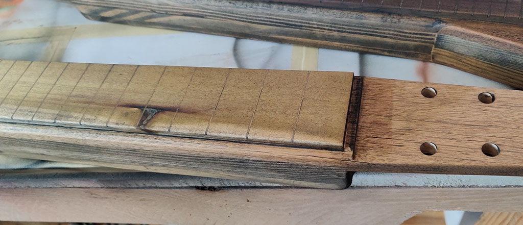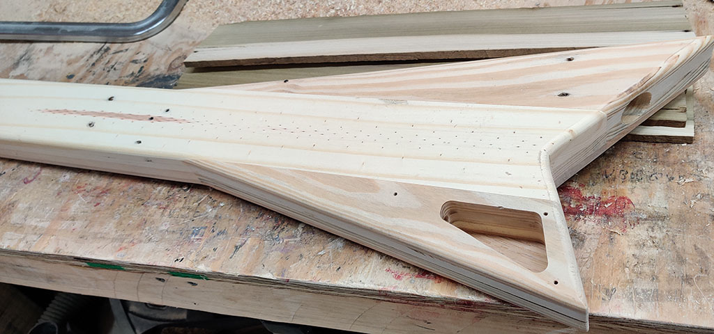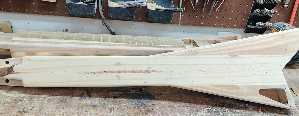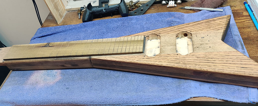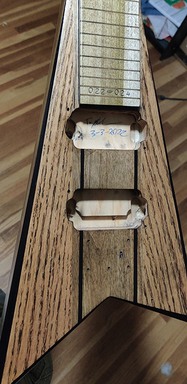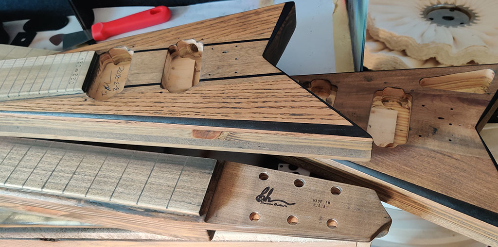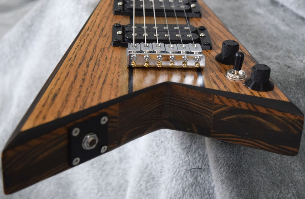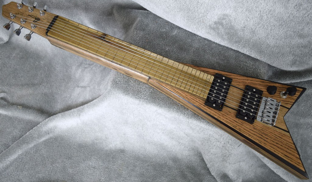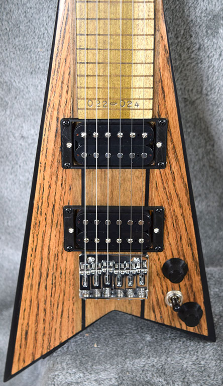 The Shannon Street-V is a more stylized version of our V that adds the feel of 80’s rock-n’-roll. The pinstriping extenuates the oak top and poplar fingerboard.