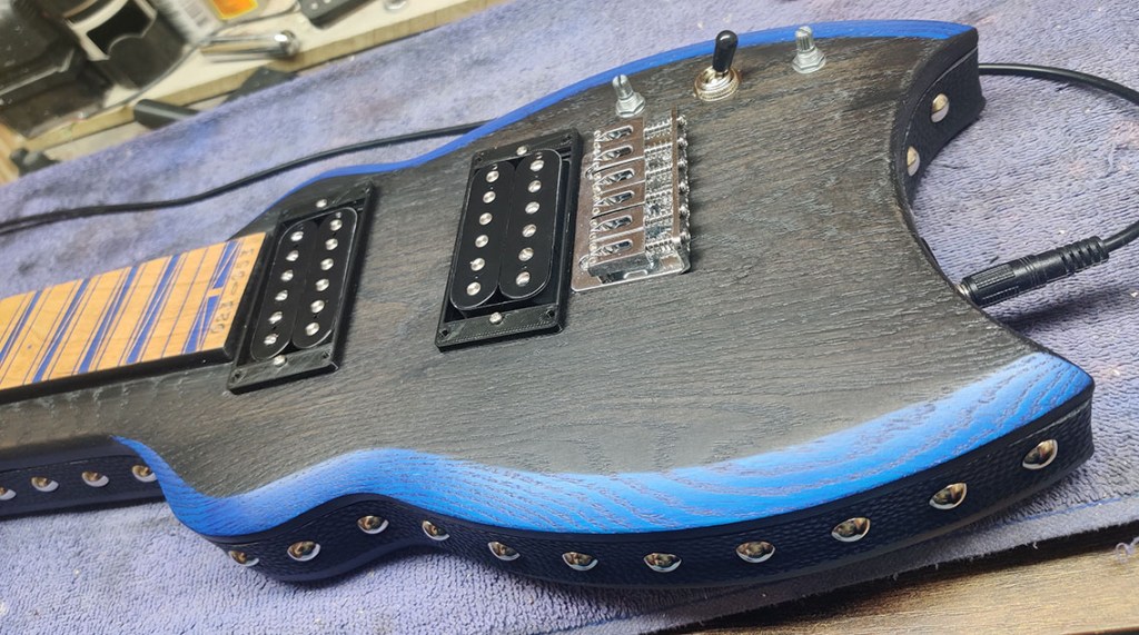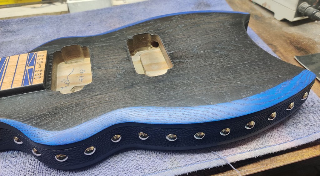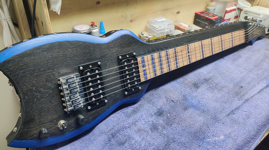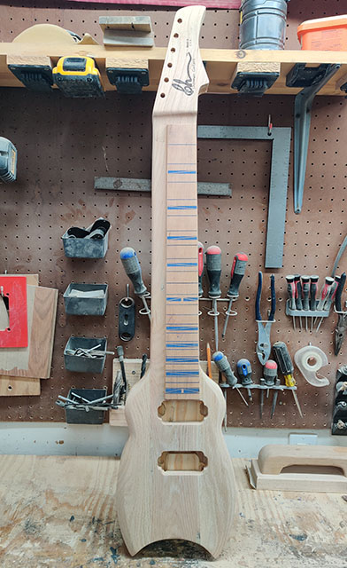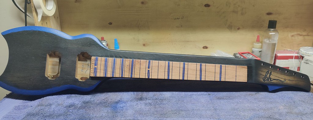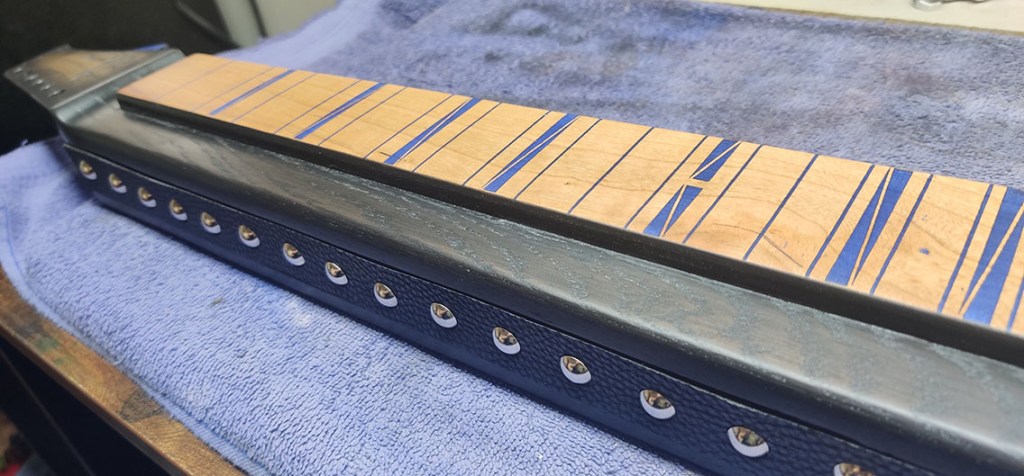 – Laser engraved frets / fret markers with blue metallic fill