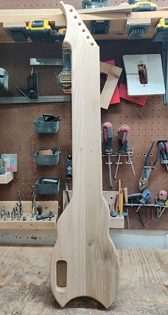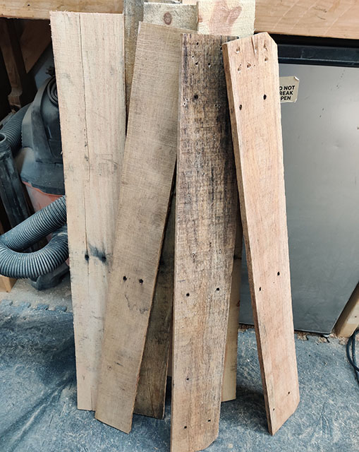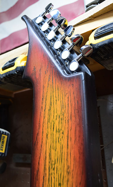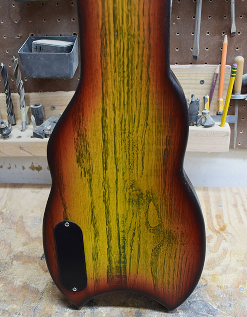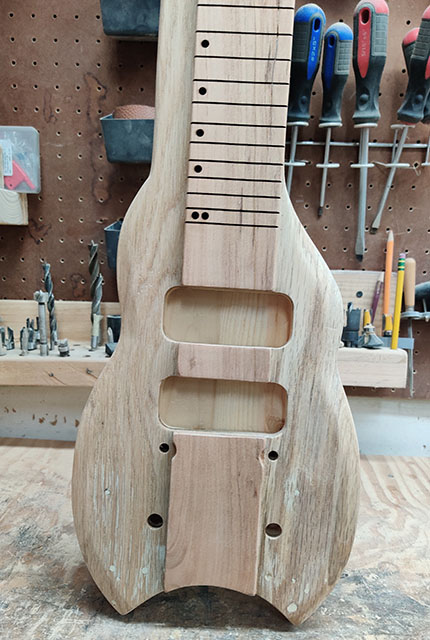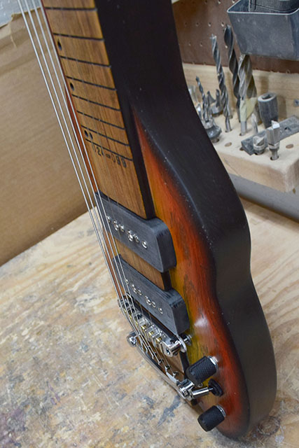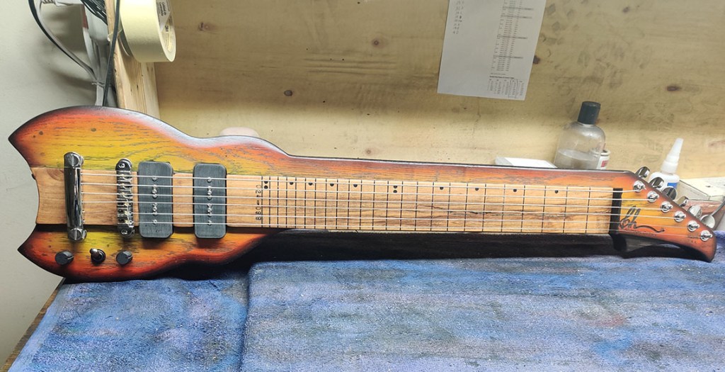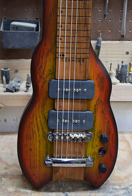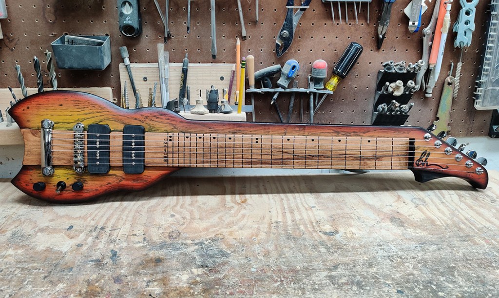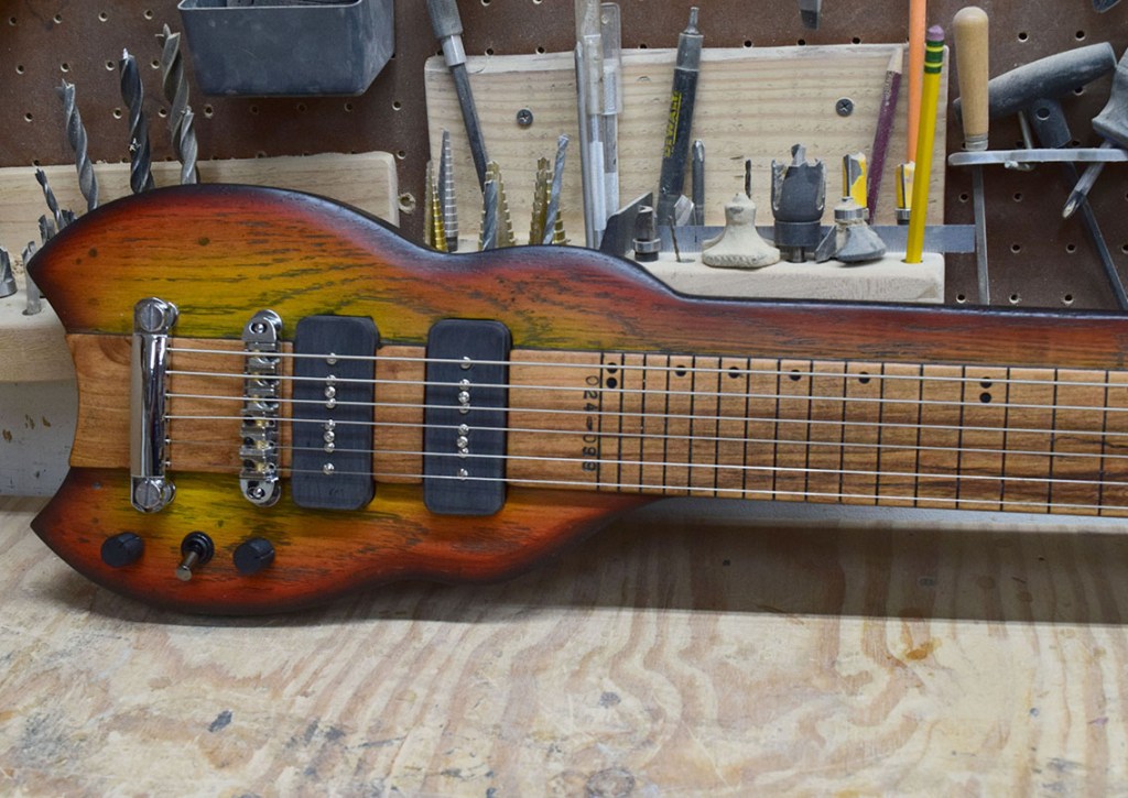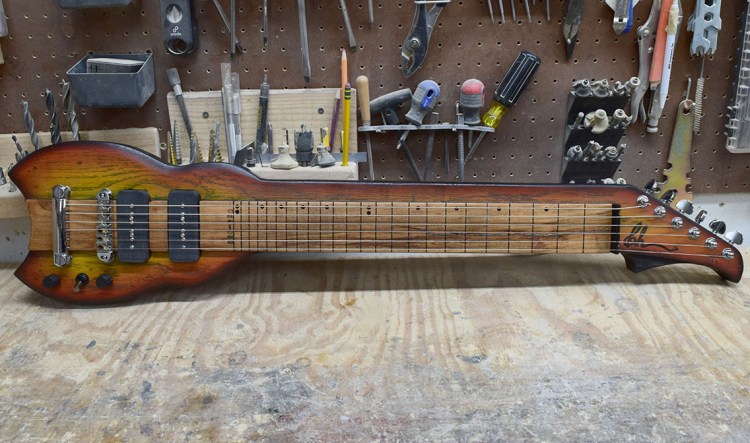 One of the first Shannon Steel guitars to feature a longer 24-inch scale, higher string action and wider spacing for ease of play. The top also features a former leg of the Shannon workbench to truly capture that reclaimed essence.