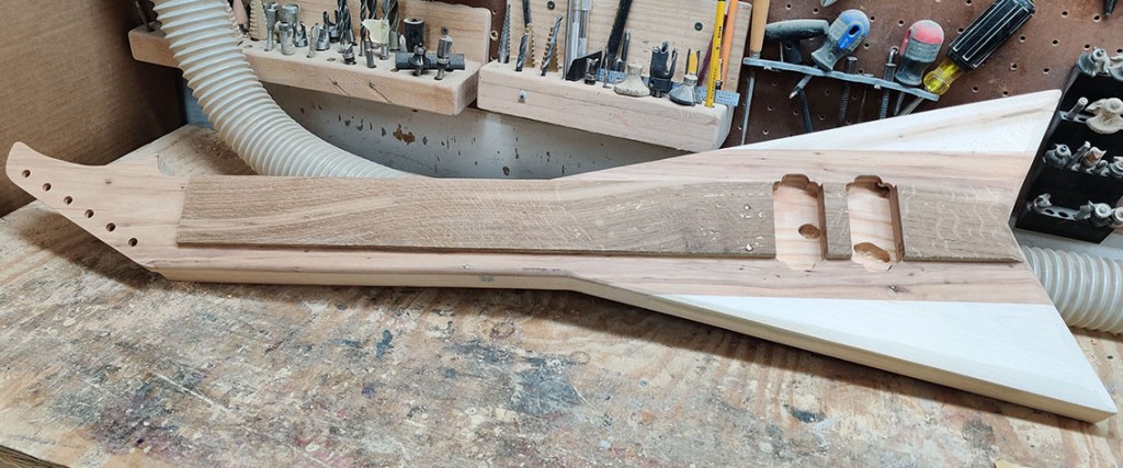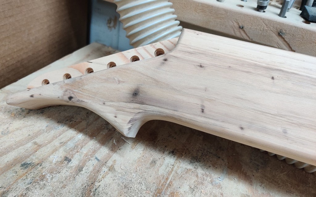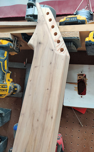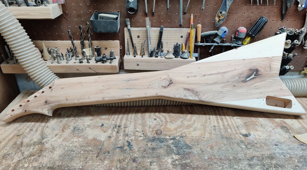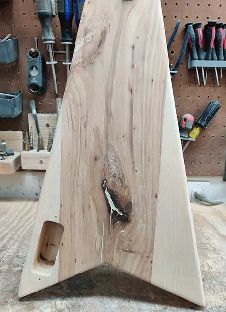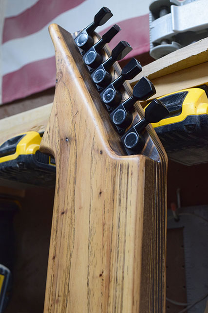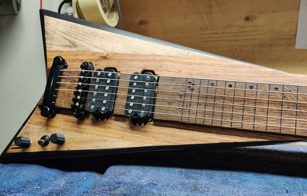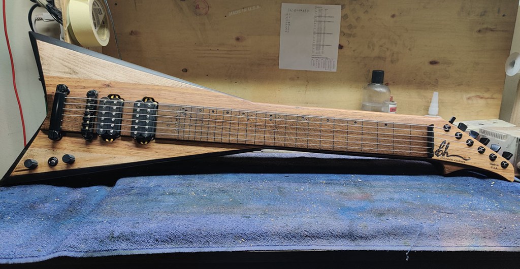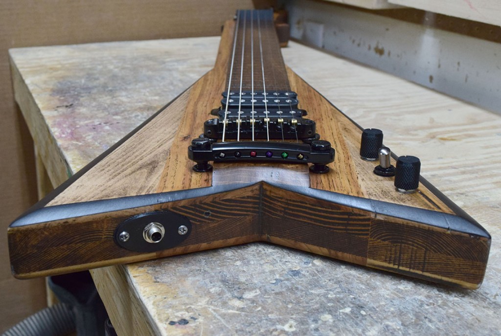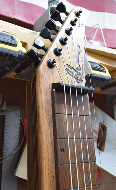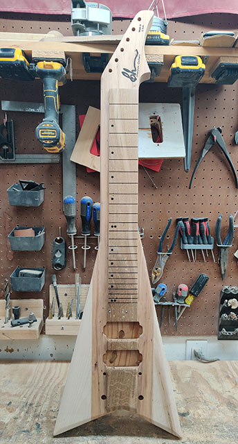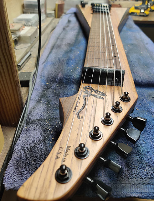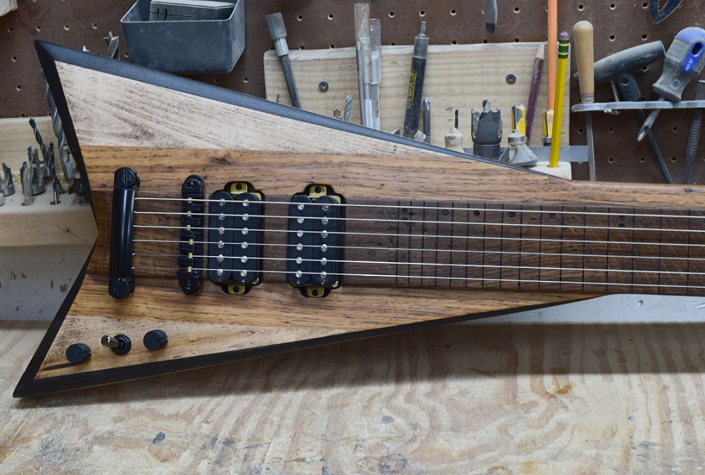 The number 100 Shannon Steel lap steel guitar! Features a longer 24-inch scale, higher string action and wider spacing for ease of play. Going back to my roots working for metal guitar brands, the 100th guitar had to be a V.